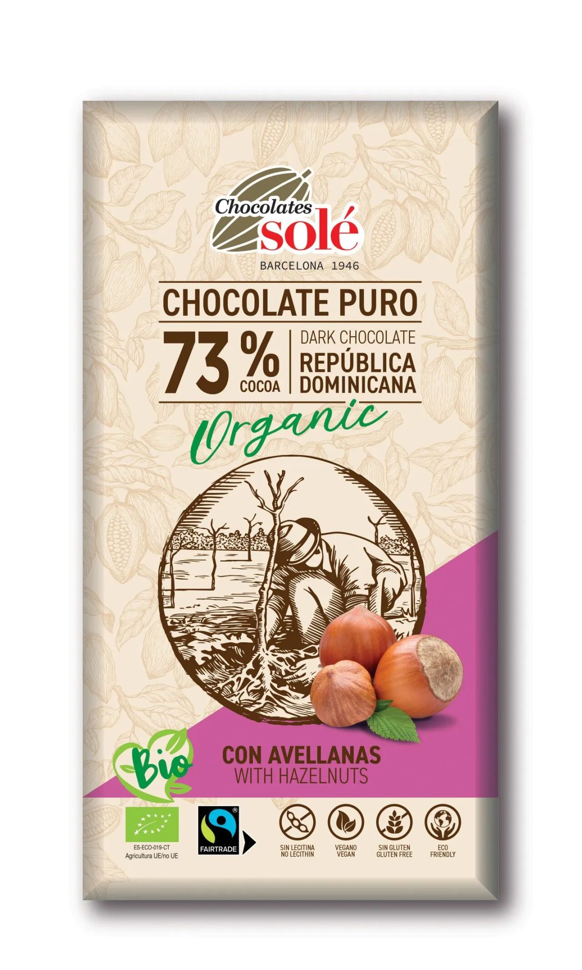 Chocolates Solé Bio étcsokoládé egész mogyoróval, 73% kakaóval, 150 g